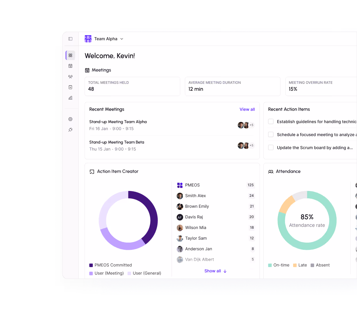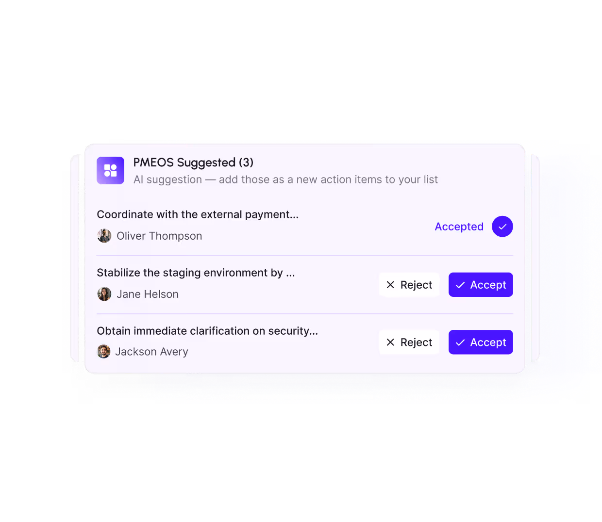 PMEOS suggests action items based on what it observes and analyzes, while the team stays in control. Actions are clear, owned, and followed through across meetings.