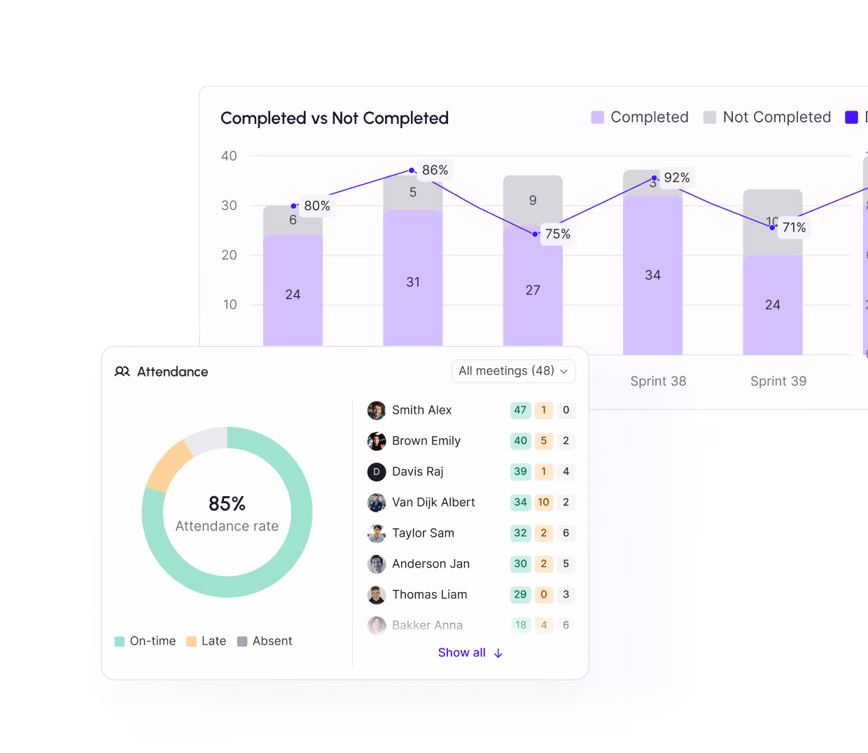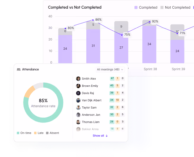 A single place for delivery visibility and improvement signals. See patterns over time, meeting effectiveness, and flow and predictability indicators derived from Jira.
