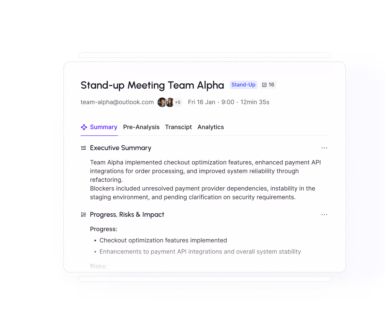 Structured meeting outcomes, action items, and analytics provide a consistent record of what happened and what needs to move next.