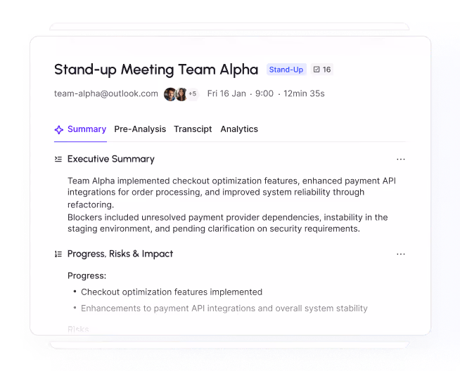 - Progress, risks, impact, and analytics based on meeting performance and Jira data